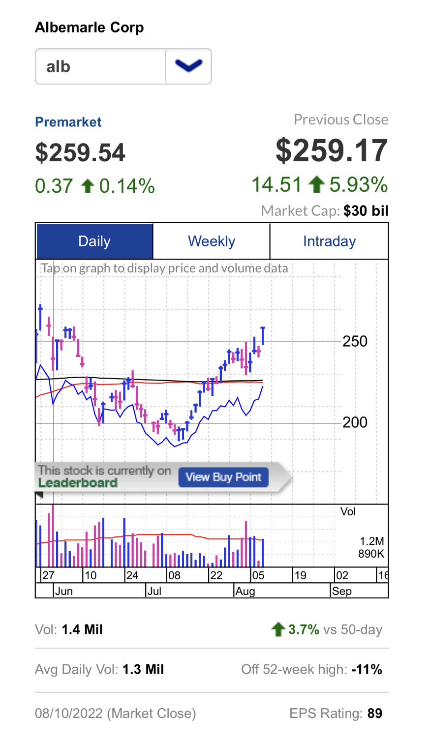 (1) ALB rose 5.98% to 259.30. It has a 273.78 buy point from a deep cup-with-handle base, according to MarketSmith Analysis. However, if one takes the 31%-deep handle as its consolidation, then ALB stock is clearing a 250.25 handle entry (see photo). Last week, ALBβs earnings easily beat expectations, with EPS up 288% & revenue 91%. The lithium giant also doubled full-year EPS guidance. Lithium prices are high and likely to stay that way, with ALB converting more contracts to spot prices.