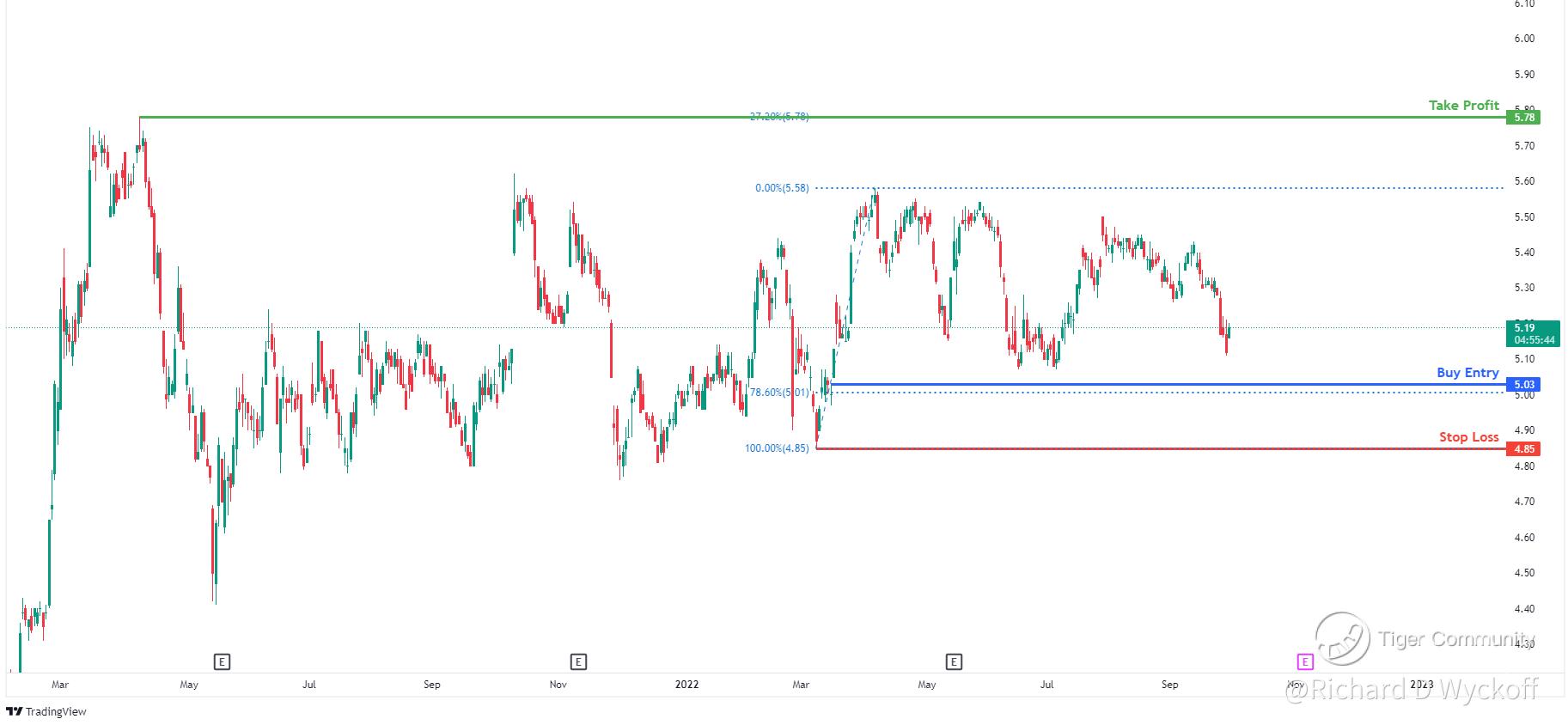 2.) The price is about to move towards the 5.00 level, which corresponds to the 78.6% Fibonacci retracement line.