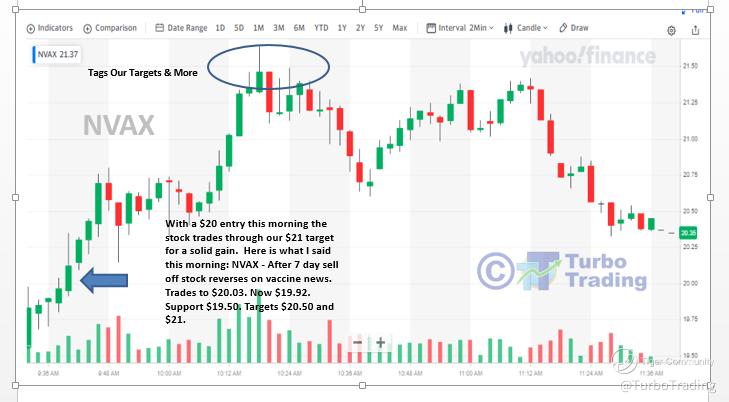 $Novavax(NVAX)$ $With a $20 entry this morning the stock trades through our $21 target for a solid gain. Here is what I said this morning: NVAX - After 7 day sell off stock reverses on vaccine news. Trades to $20.03. Now $19.92. Support $19.50. Targets $20.50 and $21.