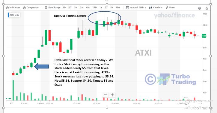 $Avenue Therapeutics Inc.(ATXI)$ Ultra low float stock reversed today. We took a $6.25 entry this morning as the stock added nearly $5 from that level. Here is what I said this morning: ATXI - Stock reverses just now popping to $5.84. Now$5.14. Support $4.50. Targets $6 and $6.35