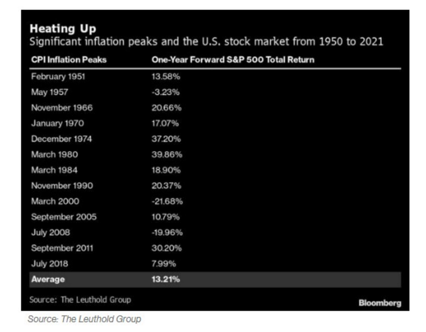 Since 1950, the S&P 500 has averaged a 13% total return in the 12 months following 13 major inflationary highs, said Jim Paulsen, chief investment strategist at Leuthold Group.
