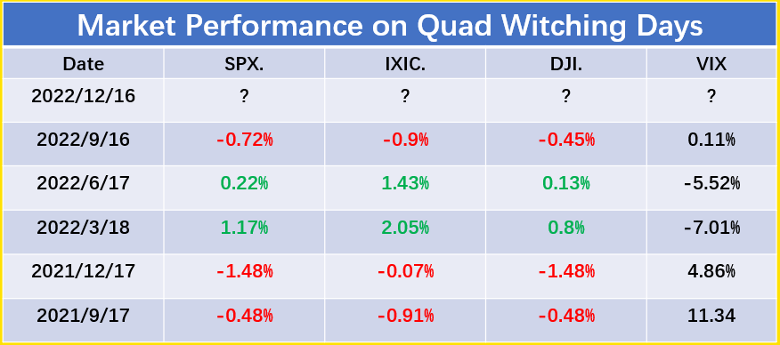 In the past 3 quad witching days in 2022, the 3 major indices $S&P 500(.SPX)$ ,$NASDAQ(.IXIC)$ , and$DJIA(.DJI)$ had a 2/1 chance of going up and down.