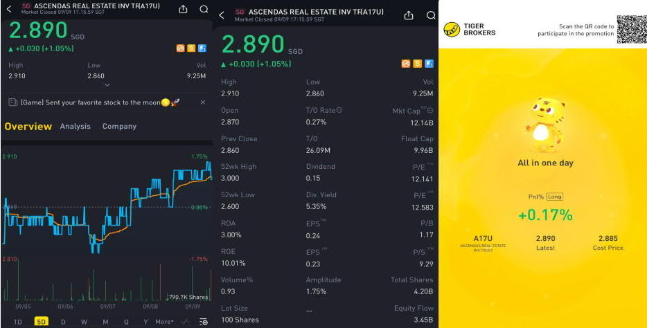 1) $ASCENDAS REAL ESTATE INV TRUST(A17U.SI)$(Dividend Yield of 5.35%, P/B Ratio of 1.17, Major Shareholder - CapitaLand Investment Ltd holding ratio of 18.04%, Weightage of 2.8% in Straits Time Index)