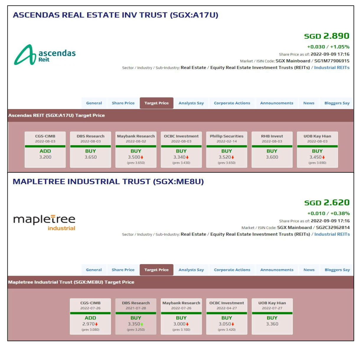 All the analysts as shown below have stated “ADD/BUY” call for the above 2 REITs. The target price for Ascendas REIT is from minimum of S$3.20 to maximum of S$3.65 and the target price for Mapletree Industrial is from minimum of S$2.97 to maximum of S$3.35.
