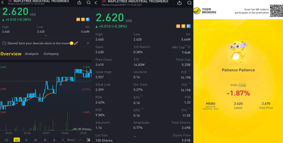2) $MAPLETREE INDUSTRIAL TRUST(ME8U.SI)$(Dividend Yield of 5.27%, P/B Ratio of 1.33, Major Shareholder - Temasek Holdings holding 25.21%, Weightage of 1.6% in Straits Time Index)
