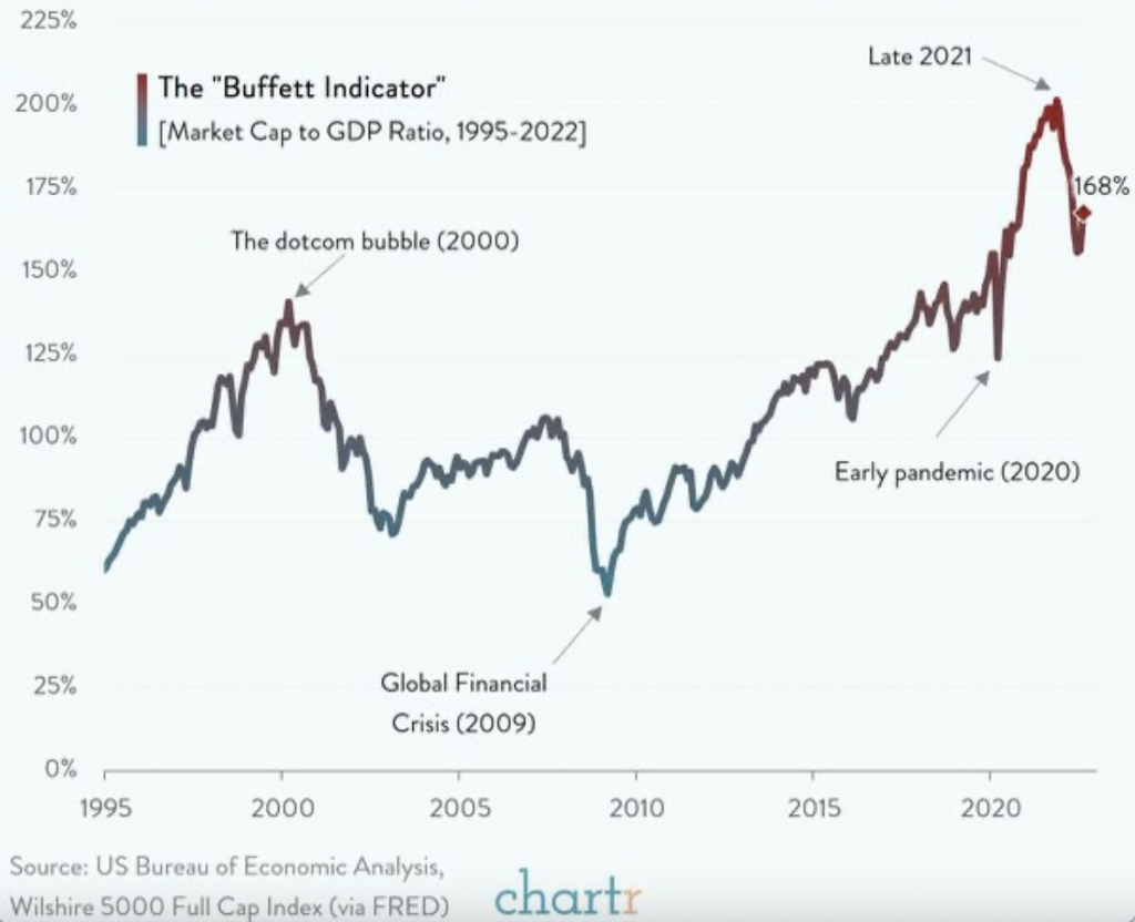 In addition to rising rates, stocks are still expensive. There are many different indicators to measure how expensive or cheap stocks are. One famous one is the Buffett Indicator (the size of the stock market in relation to the economy). Despite the 2022 sell-off, the valuation of stocks remains historically high, at levels above the Dotcom bubble from 2000.