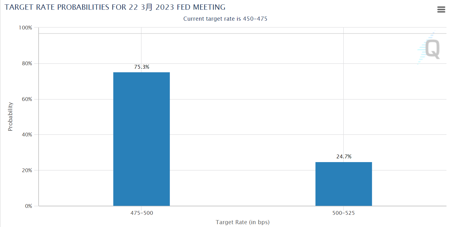 The market is still mostly betting that the FOMC meeting in March will not rashly "hike 50 basis points." The CME Fed Tool shows that the probability of a 50 basis point rate hike has been around 25%, and 75% is for a 25 basis point hike.