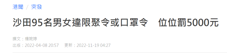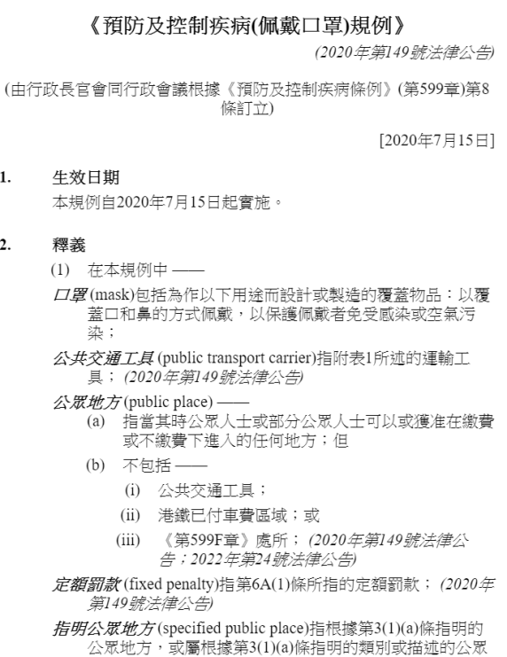 在香港政府發佈的《預防及控制疾病(佩戴口罩)規例》(2020年第149號法律公告),曾點明在公共交通工具與公眾地方必須佩戴口罩,違反口罩令將被罰處定額罰款,2022年由於違反口罩令被罰款的新聞層出不窮,例如相關新聞,沙田95名男女違限聚令或口罩令,位位罰5000元等。