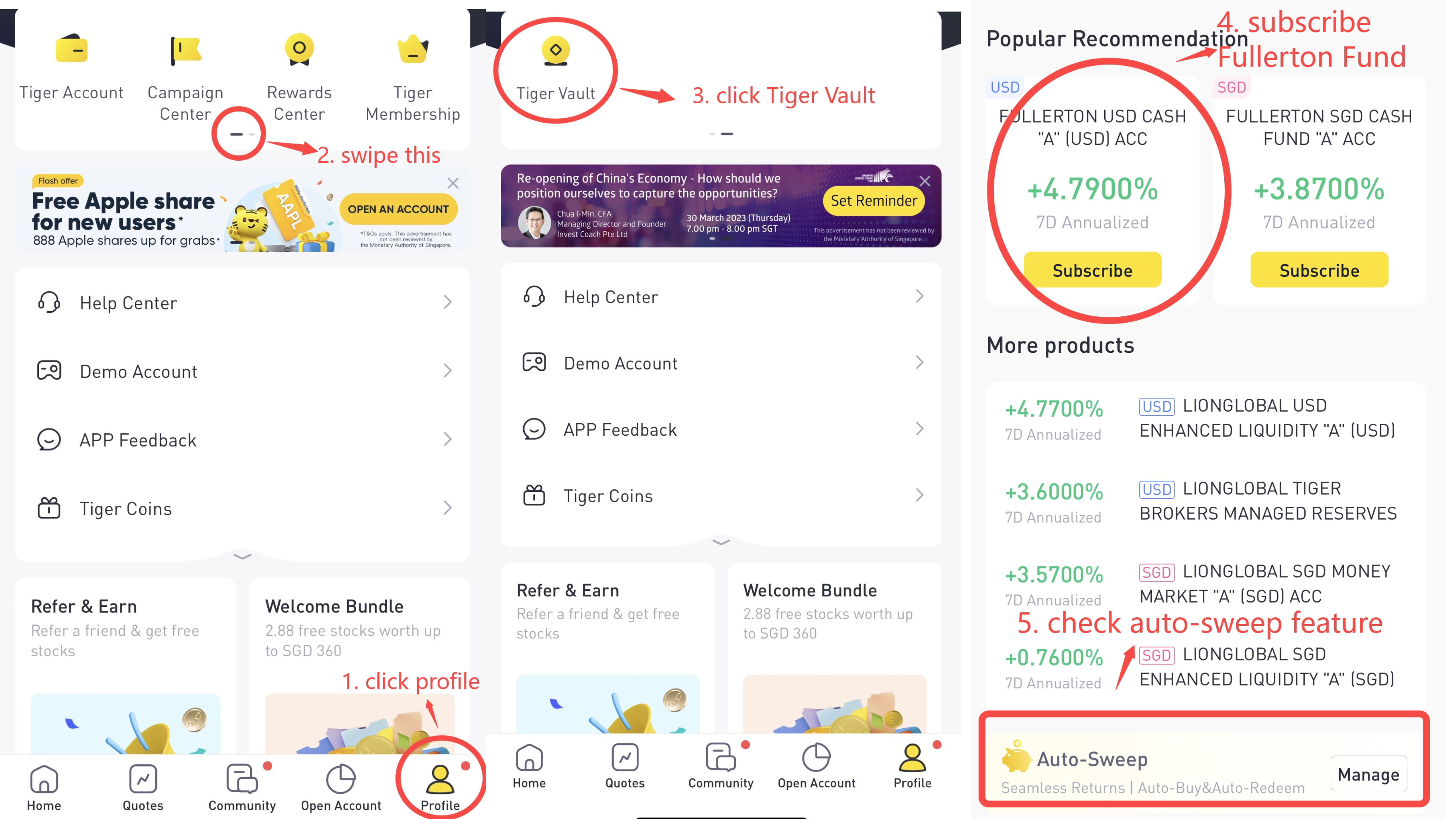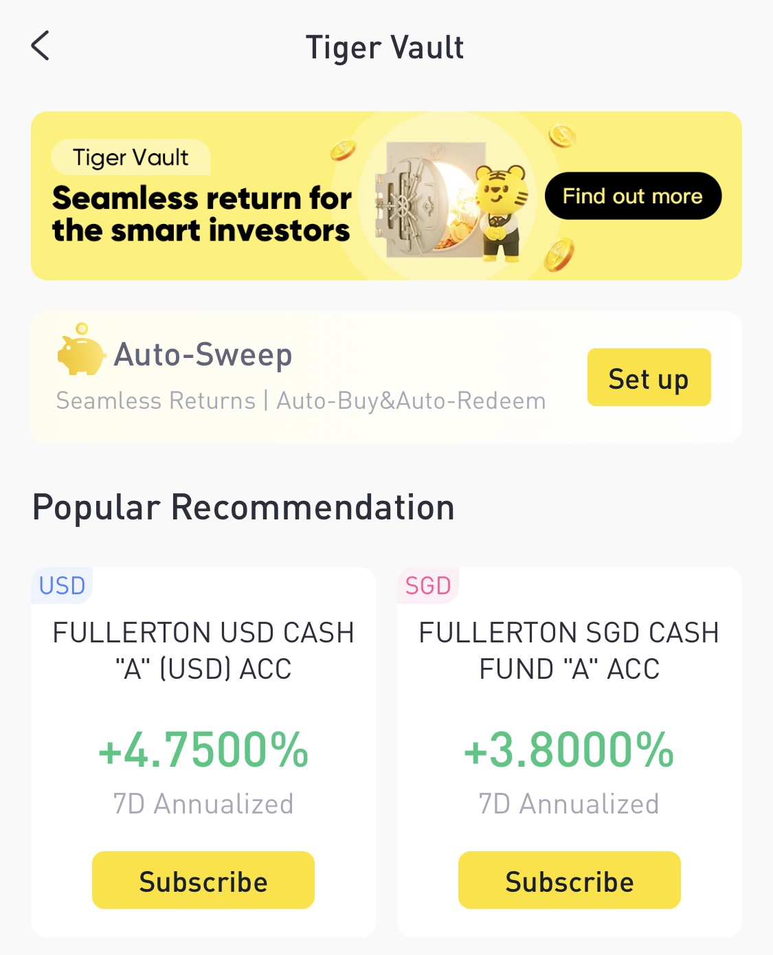 Tiger Brokers offers a cash management solution called Tiger Vault, which provides investors with yields of up to 4.75% on their idle funds. Fullerton Cash Fund for both SGD and USD are most popular picks amongst Tiger Vault funds due to its consistent performance.