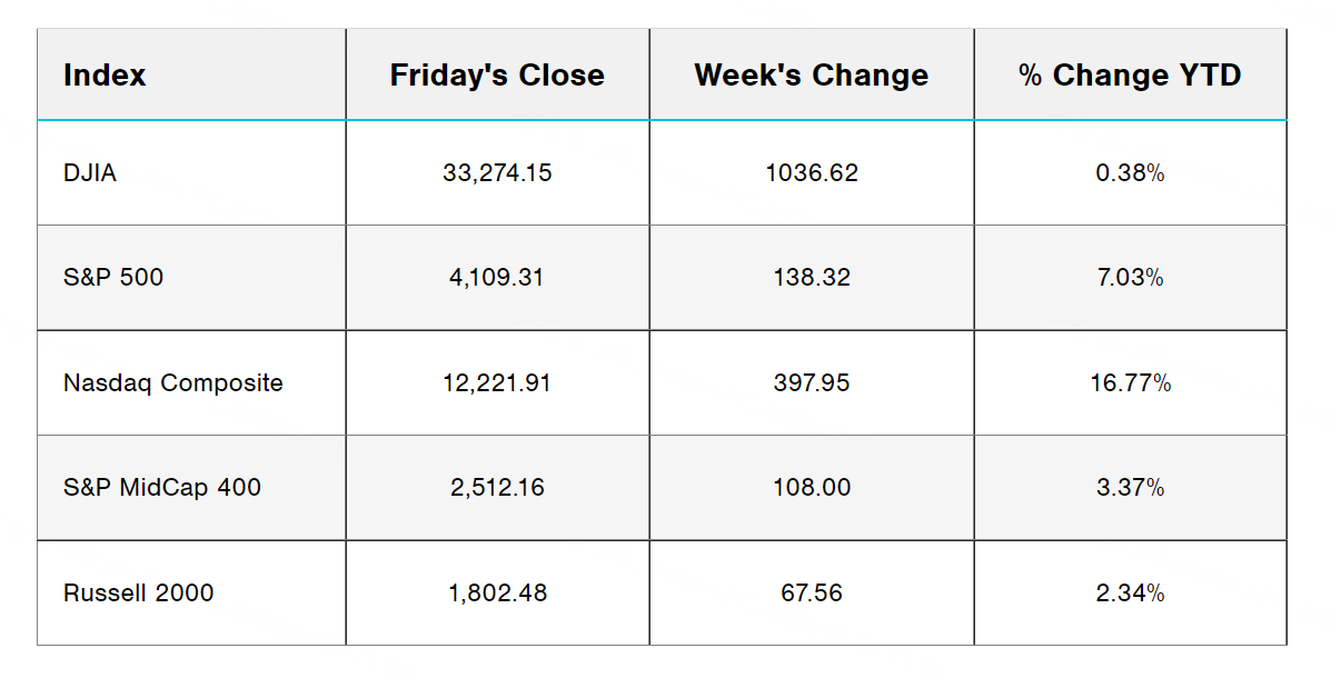 The week also brought the end of the first quarter of 2023. The technology-heavy Nasdaq Composite jumped more than 16% for the quarter, while the broad market S&P 500 Index rose approximately 7%. However, the narrowly focused large-cap Dow Jones Industrial Average was only modestly higher.