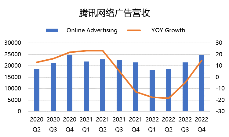 Advertising in great potential for online and offline recovery. The most overjoyed business unit of Q4 is advertising. Besides the traditional media, the content ecosystem opened by video number has played a lot of roles. Video News has released more advertising inventory including video number information flow advertising, improved advertiser demand, and strengthened the ability of advertising ecosystem to drive transactions. Advertisements drained to WeChat and applets of merchants and enterprises account for more than one-third of WeChat advertising revenue. The video number of Q4 and the reading time of applets also exceed the circle of friends. Advertisers are extremely sensitive to the efficiency of advertising transformation, and the continuous presence of advertisers also shows that the advertising efficiency of Tencent's content ecosystem is improving. With the strengthening of enterprise activities after the epidemic in 2023, the advertising business is expected to further recover in 2023.