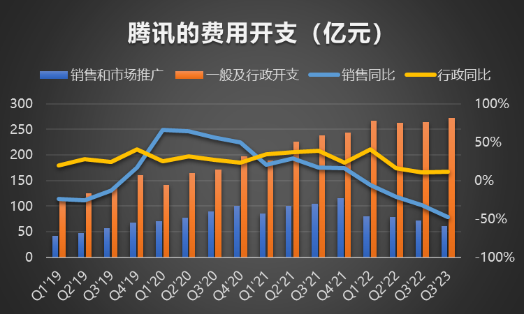 Cost reduction and efficiency increase continued, core profit indicators beats.Q4 Tencent's gross profit margin was 42.65%, up 150bps year-on-year, but down from 44.24% in the previous quarter. Tencent is shrinking its clothes and dieting in other businesses, and its marketing cost has been cut by 47%. Only the cost growth in online video and mobile advertising alliance is higher, which is also the focus of growth in 23 years. The increase in management expenses is, on the one hand, the investment in overseas business, such as overseas games, and on the other hand, the one-time layoff cost.