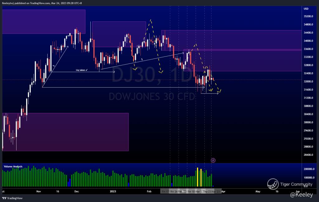 Price consolidated since my last analysis. Price is still respecting the bearish POI at 33582.6 and price is unable to push higher despite grabbing external liquidity at 31708.6. I'm expecting price to continue lower from here, taking out the sell-side liquidity at 31416.6.