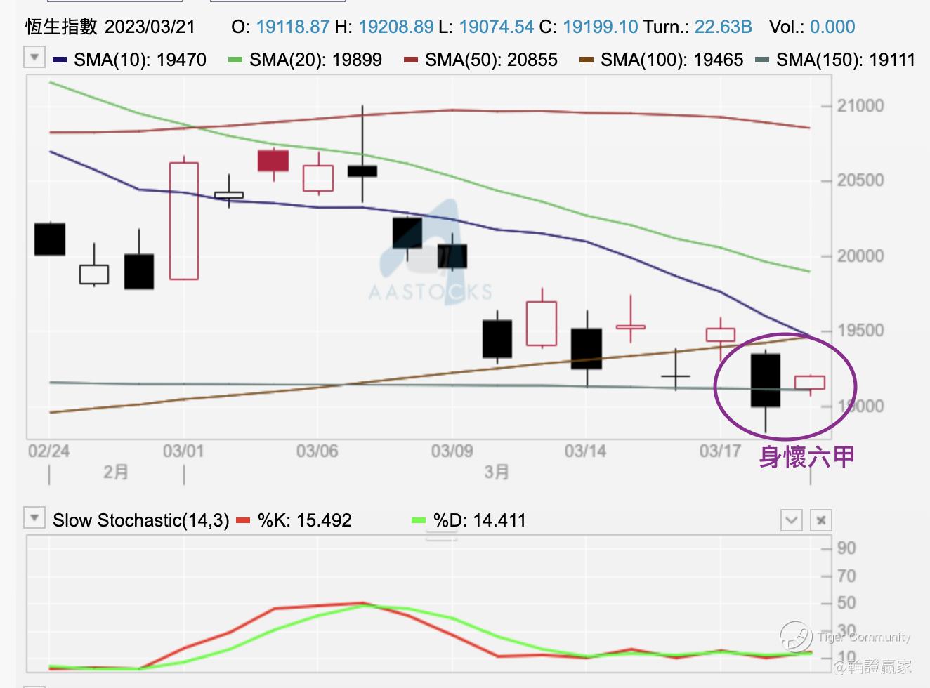 睇咗個日線圖先,噚日指數稍稍失守150天線,今日再睇指數算是重上150天線之上,依家10點5分,恆指暫時低位見19074點,同150天線(約19111點),一度失守37點,但依家算是守得到。同時留意到目前陰陽燭形態出現咗「身懷六甲」,當然呢個係未確定啦,要收市真係收得到呢個樣先到可以確認嘅,但喺咁關鍵嘅150天線之上出現轉勢嘅「身懷六甲」,或者對好友嚟講都係一件好事。