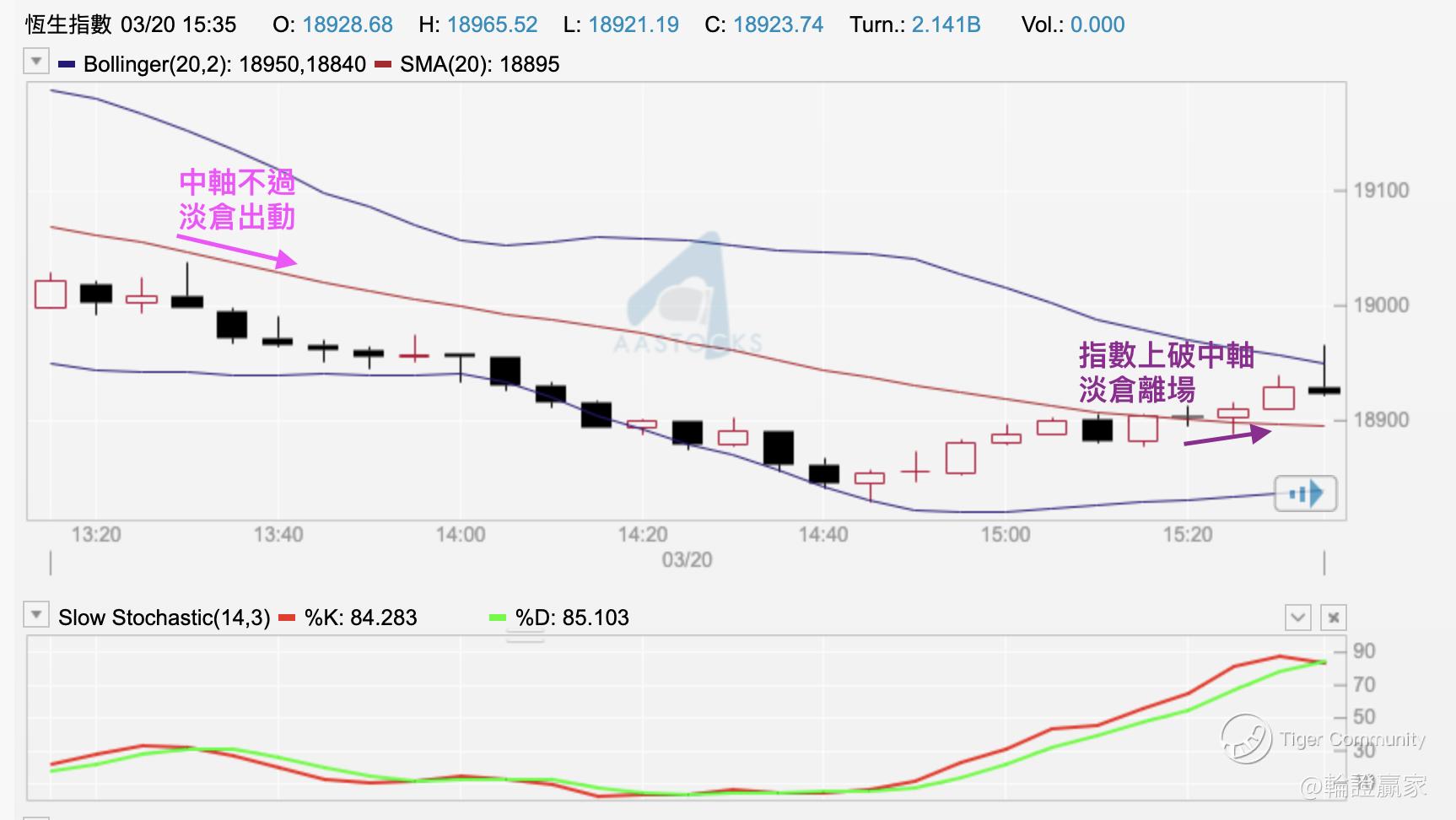 噚日揀咗隻 $UB#HSI RP2404T.P(56856)$ 出嚟,只係打算做下Day Trade,以五分鐘圖 $HSI(HSI)$ 唔過中軸為由出隻淡倉,順住依家所見嘅整條保歷加通道向下運行。