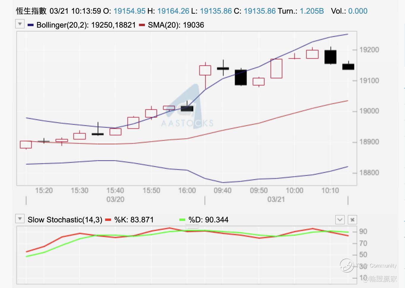 依家9點58分,恆指仍然保持綠燈,只係升幅一度縮到得返100點都唔夠,依家再次擴大至升緊177點,報19178點。五分鐘圖上見整條保歷加通道呈上,所以都要預咗指數稍稍回一回問下方嘅平均線借力先至有可能再上過。