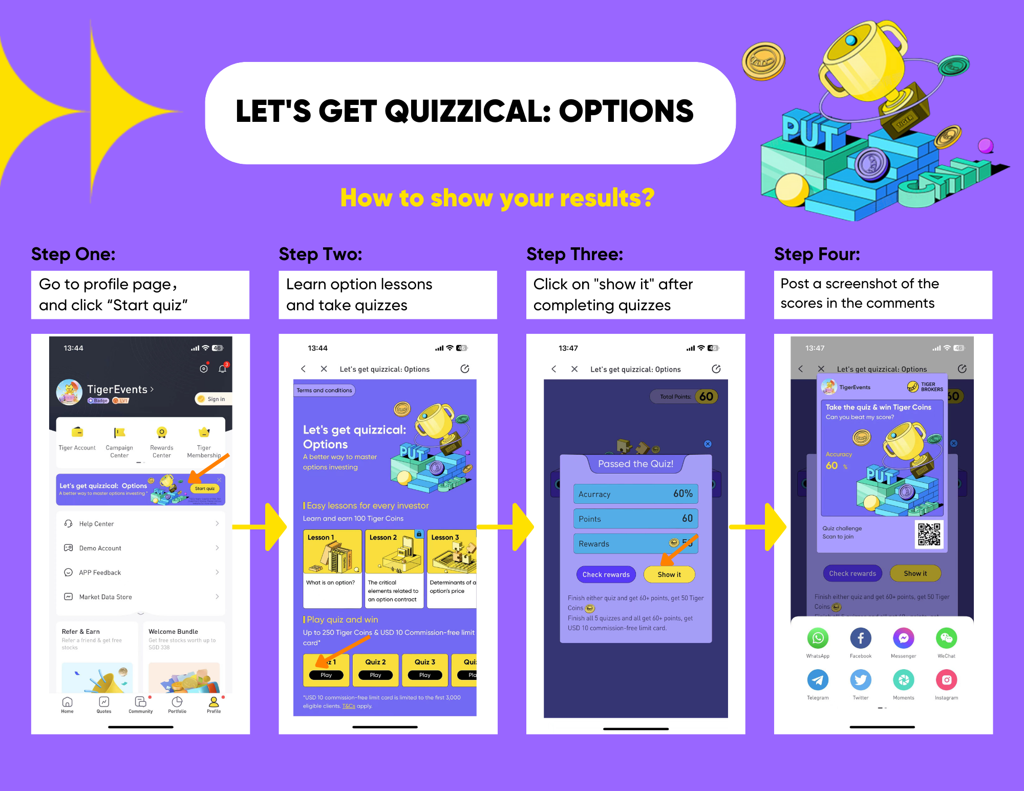 🌟🌟🌟I must confess that Options Trading is my Achilles Heel but fortunately with Tiger Options Quiz, I have learnt so much. My best score is 60%.