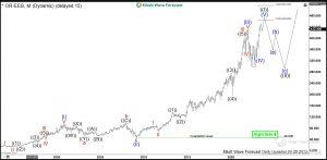 Short term traders can be still looking to buy pullbacks within wave III against 365.80 lows, expecting wave III to extend. Also, pullback in wave IV should find support for more upside in wave V. The target will be 465.45-516.74 area. For investors, on the other hand, it is time to become cautious. Indeed, the cycle in black wave ((I)) looks mature and a correction against all-time lows should happen soon. Therefore, investors do better to wait for a larger pullback in 3, 7, 11 swings against all-time lows. Monthly chart shows the idea of buying lower in 3 swings.