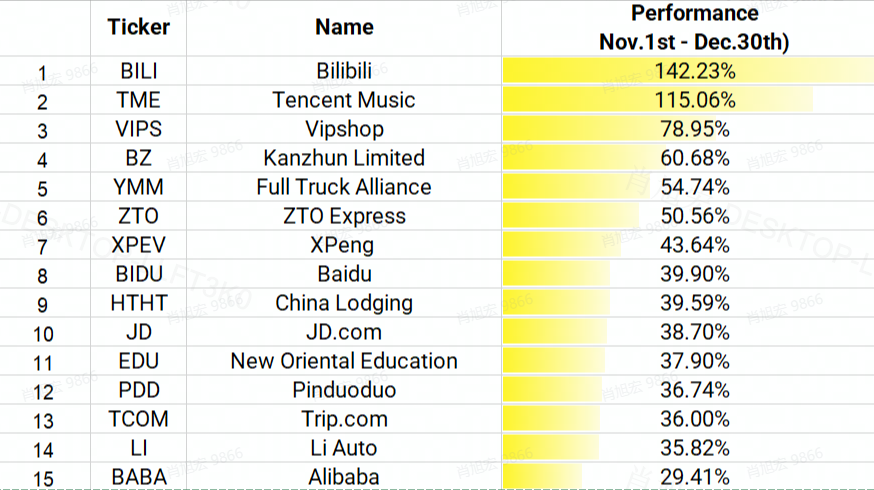 1). The No. 1 performer $Bilibili Inc.(BILI)$ just hosted the 2022 New Year's Eve party. According to data, the peak live broadcast popularity reached 330 million that night, setting a new record, which stimulated bilibili to rise by nearly 14%, BILI has risen by 142% in the last two months in 2022. Its Q322 results showed its revenue reached RMB 5.8 billion increased by 11% year-on-year, and its net loss of RMB 1.7 billion narrowed by 36% year-on-year. $Bilibili Inc.(BILI)$ is working to reduce costs and increase efficiency. Interested investors can continue to pay attention to it's progress in value-added, games, e-commerce, and advertising businesses.