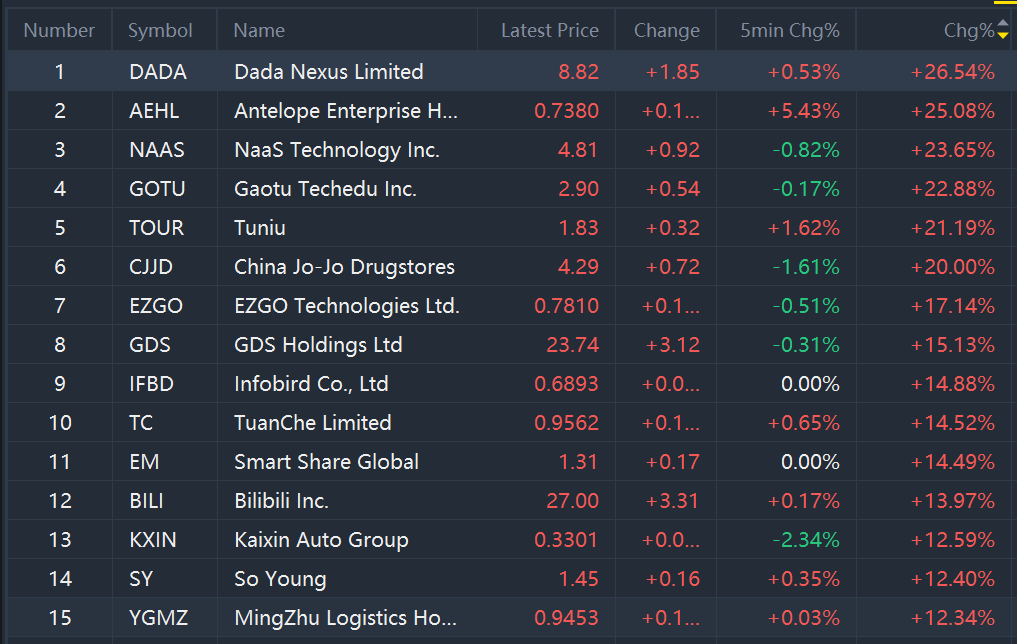 There are 25 ADRs increased more than 10% in prices. Among them, $Dada Nexus Limited(DADA)$ $Antelope Enterprise Holdings Limited(AEHL)$ , $NaaS Technology Inc.(NAAS)$ , $Gaotu Techedu Inc.(GOTU)$ , $Tuniu(TOUR)$ , $China Jo-Jo Drugstores(CJJD)$ , $EZGO Technologies Ltd.(EZGO)$ , and $GDS Holdings Ltd(GDS)$ had increased more than 15%.