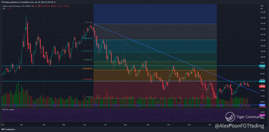 The reopen of China economy might also pose risk to higher inflation. Cyclical commodity price such as copper $Copper - main 2303(HGmain)$ and crude oil $Light Crude Oil - main 2303(CLmain)$ moved higher, offsetting the demand destruction concern resulted from a potential global recession. NYMEX WTI Crude Oil$W&T Offshore(WTI)$ Futures broke the downtrend, a further breakthrough above $USD Index(USDindex.FOREX)$ USD82.64 might confirm a formation of uptrend, and could test USD93.64(Q4 double top high) and then USD96.97 (50% retracement). Any further expansionary fiscal policy targeting property or infrastructure sector in China, could also push the commodities price higher and thus the inflation.