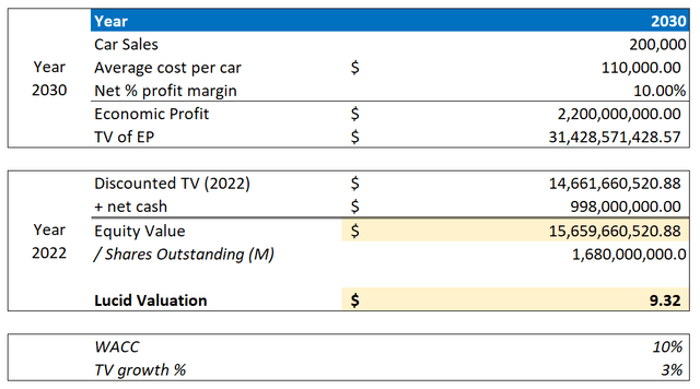 First, I want to acknowledge that LCID is a high-growth company. And accordingly, I want to base my analysis not on current numbers, but on what I believe could be achieved in 2030. That said, for the base-case, I anchor my valuation on an estimated 200,000 car sales in 2030, and an average sales price per car of $110,000. Furthermore, I assume a net profit margin of only 10%. Notably, this is below both Tesla's2022 net profit margin of 15% and Porsche's2022 net profit margin of close to 14%. Thus, in my opinion, 10% is a very reasonable assumption if one considers increased economies of scale. (Note that I expect sales volume to be almost 10x.)