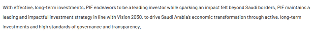 PIF has a stated mandate of driving the transformation of the Saudi Arabian economy. Here's a statement from the fund's official website: