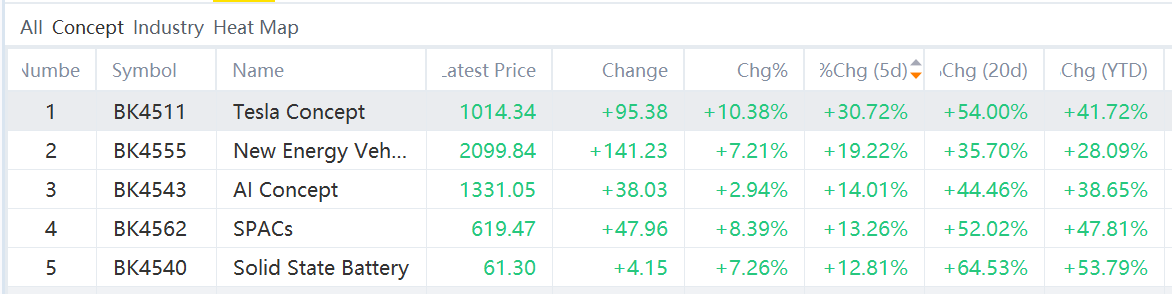 The 5 best-performing concepts of last week are Tesla Concept, New Energy Vehicle Concept, AI Concept, SPACs, and Solid State Battery.