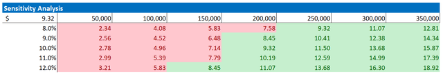 Personally, I believe 200,000 cars sold is not unreasonable, given Lucid's technology advantage in the EV market and strength of brand. It is about one-third lower than what Porsche is currently selling. However, readers should feel free to challenge my assumption - see sensitivity table below.
