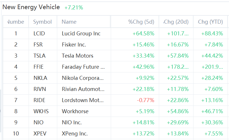 Tesla earnings recharged shares by 33.34% this week which led the new energy vehicle concept to the top 5. In addition to $Tesla Motors(TSLA)$, the best performer in the new energy concept is $Lucid Group Inc(LCID)$.