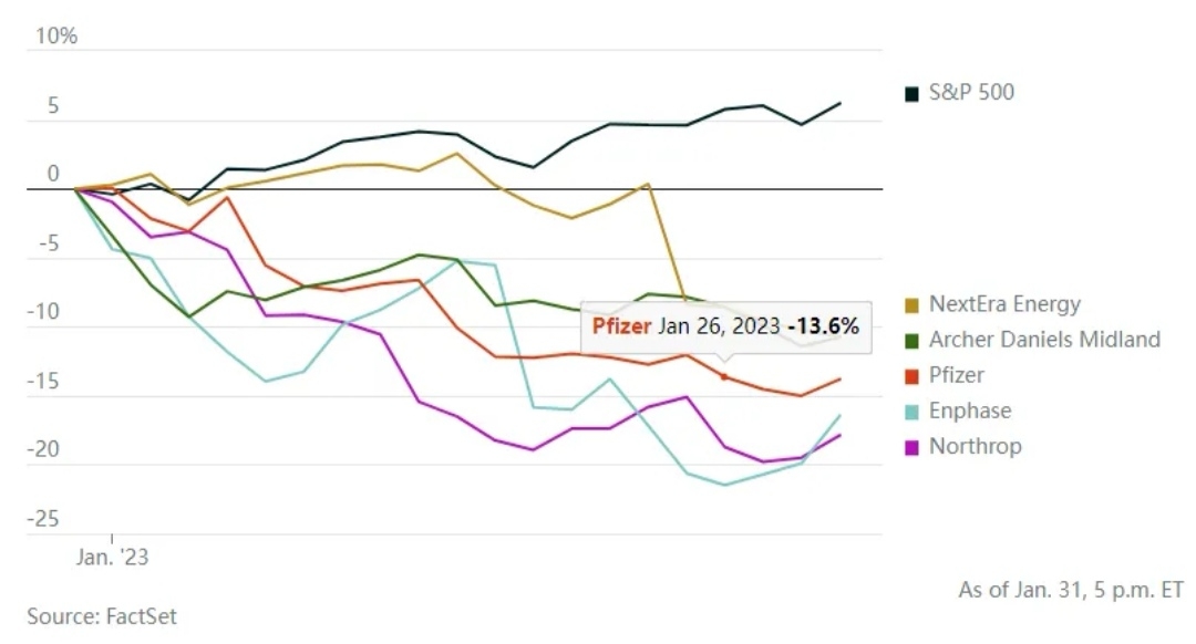 $Pfizer(PFE)$ shares are down 15% in January, the third worst performer in the S&P 500. The drug maker on Tuesday laid out a financial forecast for the 2023 fiscal year well below Wall Street consensus figures. The company expects fewer people to receive Covid-19 vaccines in 2023. The company's stock was down 10% in 2022.