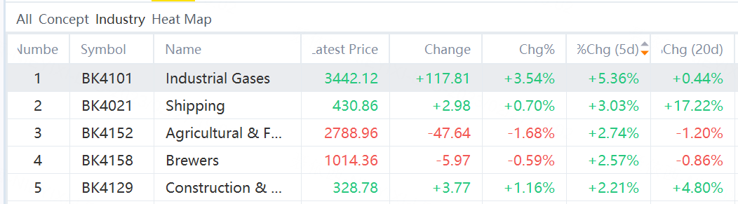 3 of the 3 indexes closed red last week. $S&P 500(.SPX)$ led, and $NASDAQ(.IXIC)$ lagged with -3.33%. The 5 best-performing industries of last week are industrial gases, shipping, agricultural & farm machinery, brewers and construction and engineering.