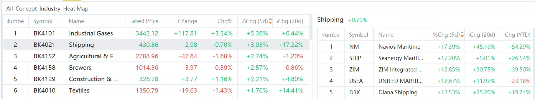Looking at the industry of shipping, the top 5 stocks all have strong performance in the last week, including $Navios Maritime(NM)$, $Seanergy Maritime(SHIP)$, $ZIM Integrated Shipping Services Ltd.(ZIM)$, $UNITED MARITIME CORPORATION(USEA)$ and $Diana Shipping(DSX)$.