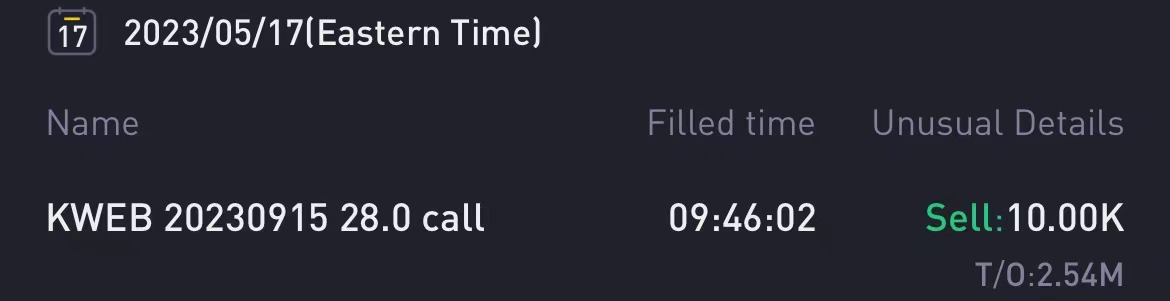 An institution sold the call of KWEB option with an exercise price of 28, the expiration date is September 15, and the total amount of the order is 2.54 million. This is a standard one leg sell call large order, traders see KWEB below $28 through September 15th, or a sustained sideways movement that never breaks through 28.