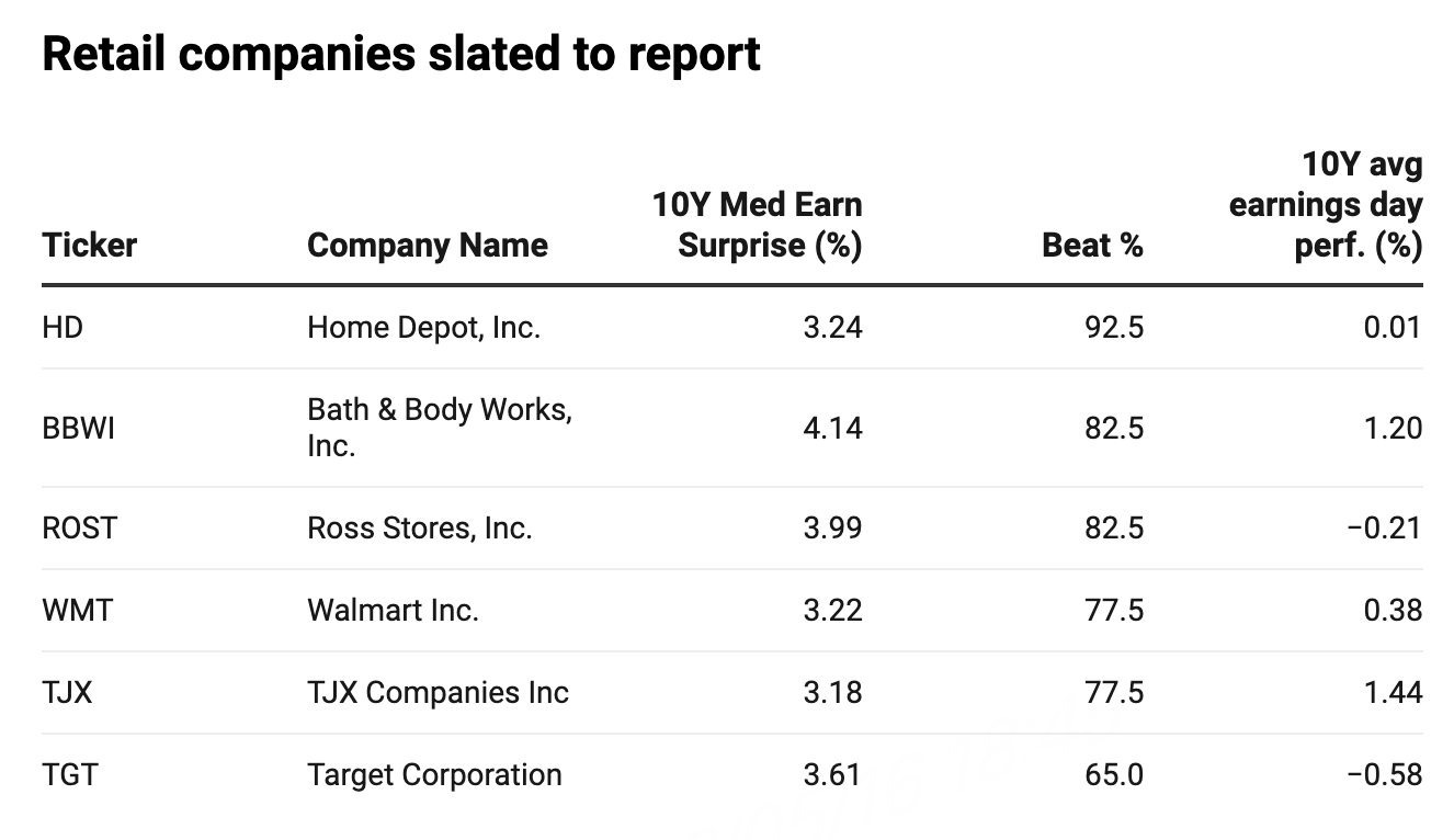 Given this backdrop, CNBC Pro screened the S&P 500 to see how the retailers reporting this week typically fare on earnings.