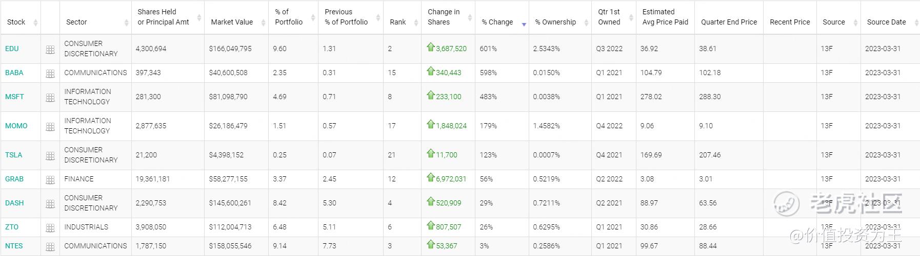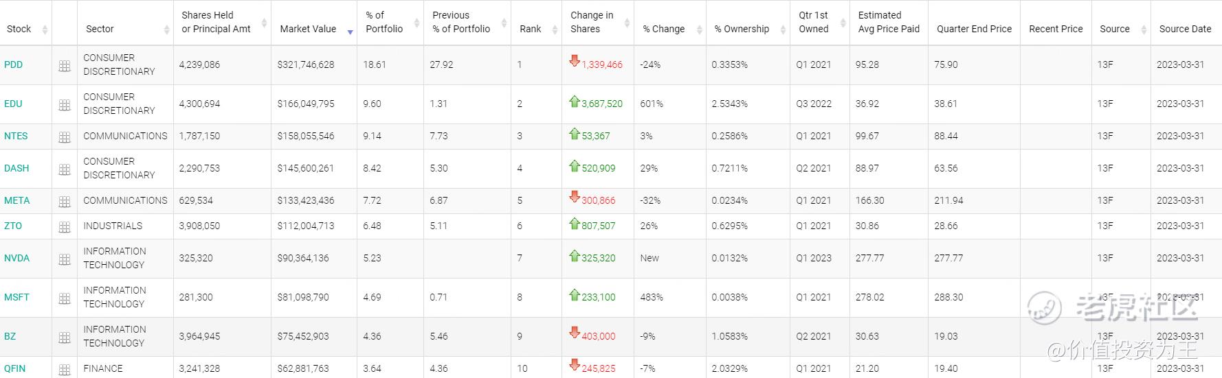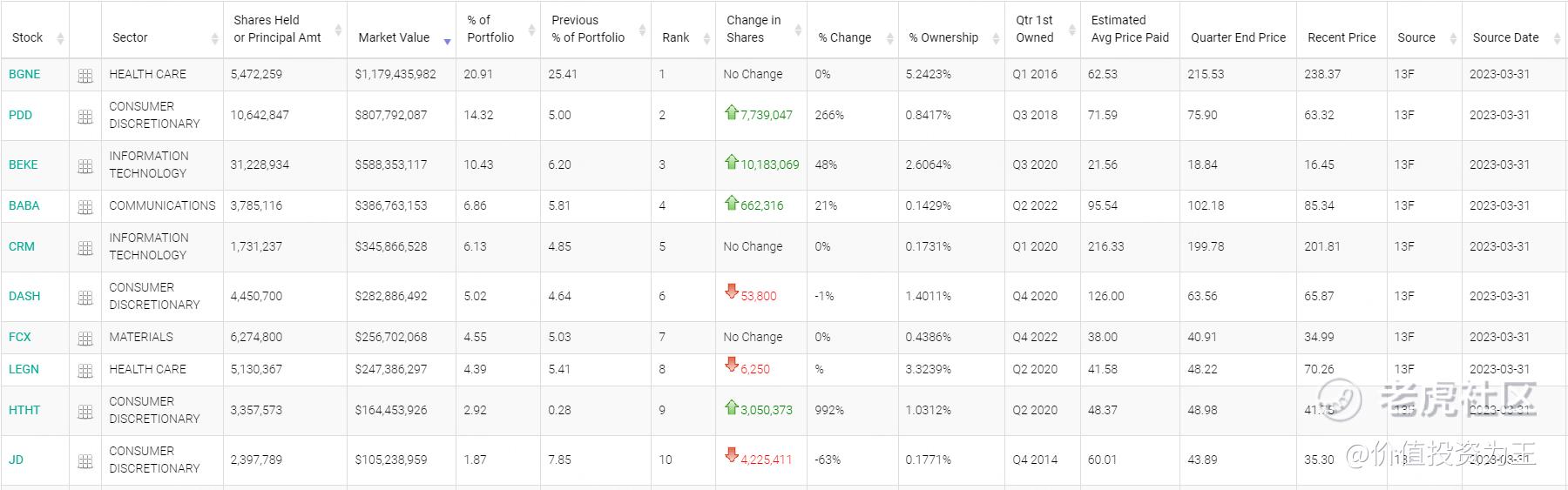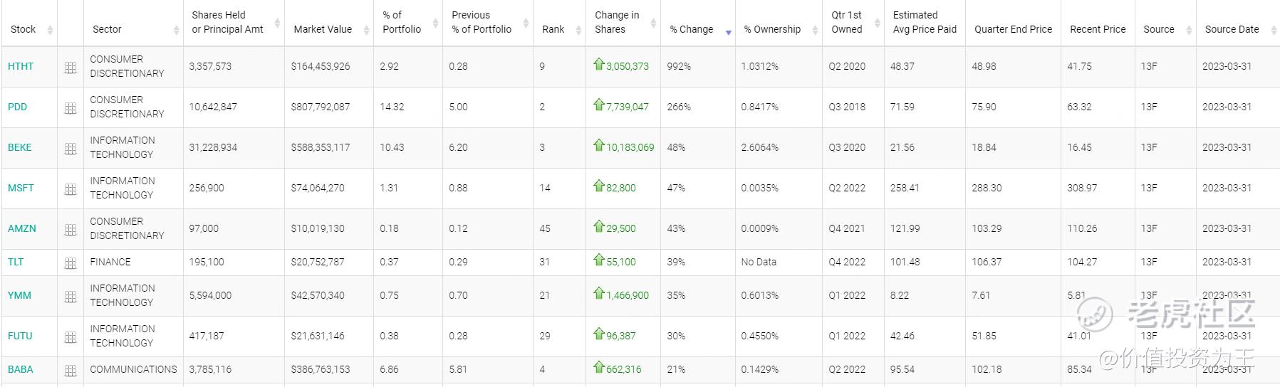 First, let's take a look at Hillhouse's positions. Among the top 10 holdings by market capitalization, Hillhouse increased its holdings in Pinduoduo $Pinduoduo Inc.(PDD)$ , Beike $KE Holdings Inc.(BEKE)$ $KE Holdings Inc.(02423)$ , Alibaba $Alibaba(BABA)$ $Alibaba(09988)$ and Huazhu $HUAZHU-S(01179)$ , while reduced its holdings in DASH $DoorDash, Inc.(DASH)$ , Legend Biotech $Legend Biotech(LEGN)$ and JD.com $JD.com(JD)$ $JD-SW(09618)$ in the first quarter :