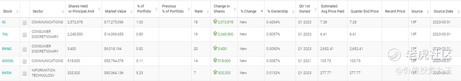 Greenwoods newly built five stocks in the first quarter, with large amounts of Nvidia $NVIDIA Corp(NVDA)$ and Google $Alphabet(GOOG)$ $Alphabet(GOOGL)$ :