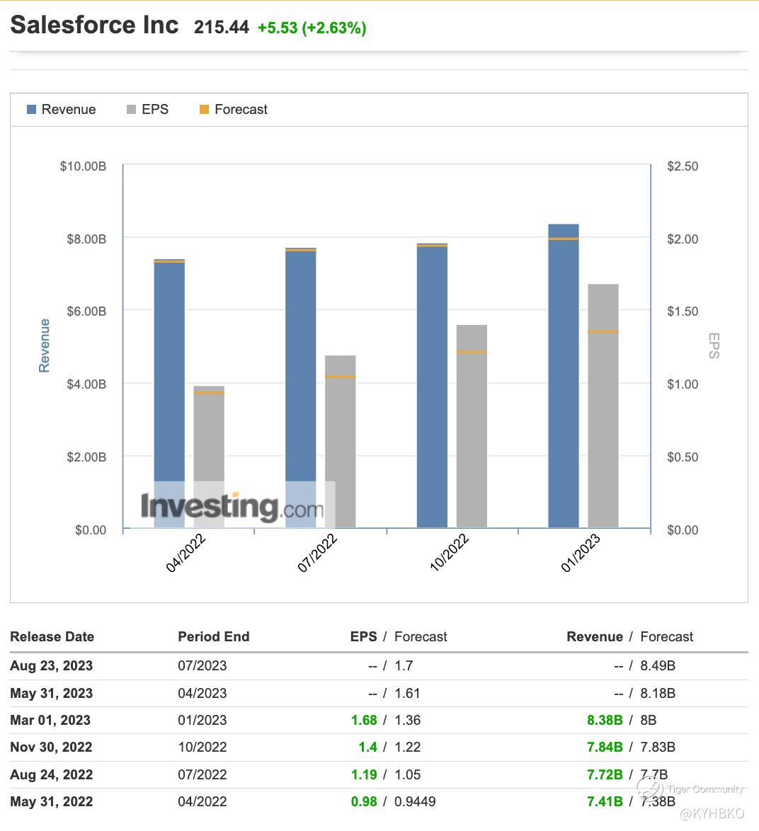 For the coming earnings, the forecast (from investing) for EPS and Revenue are 1.61 and 8.18B respectively. Will Salesforce be able to beat the forecast?