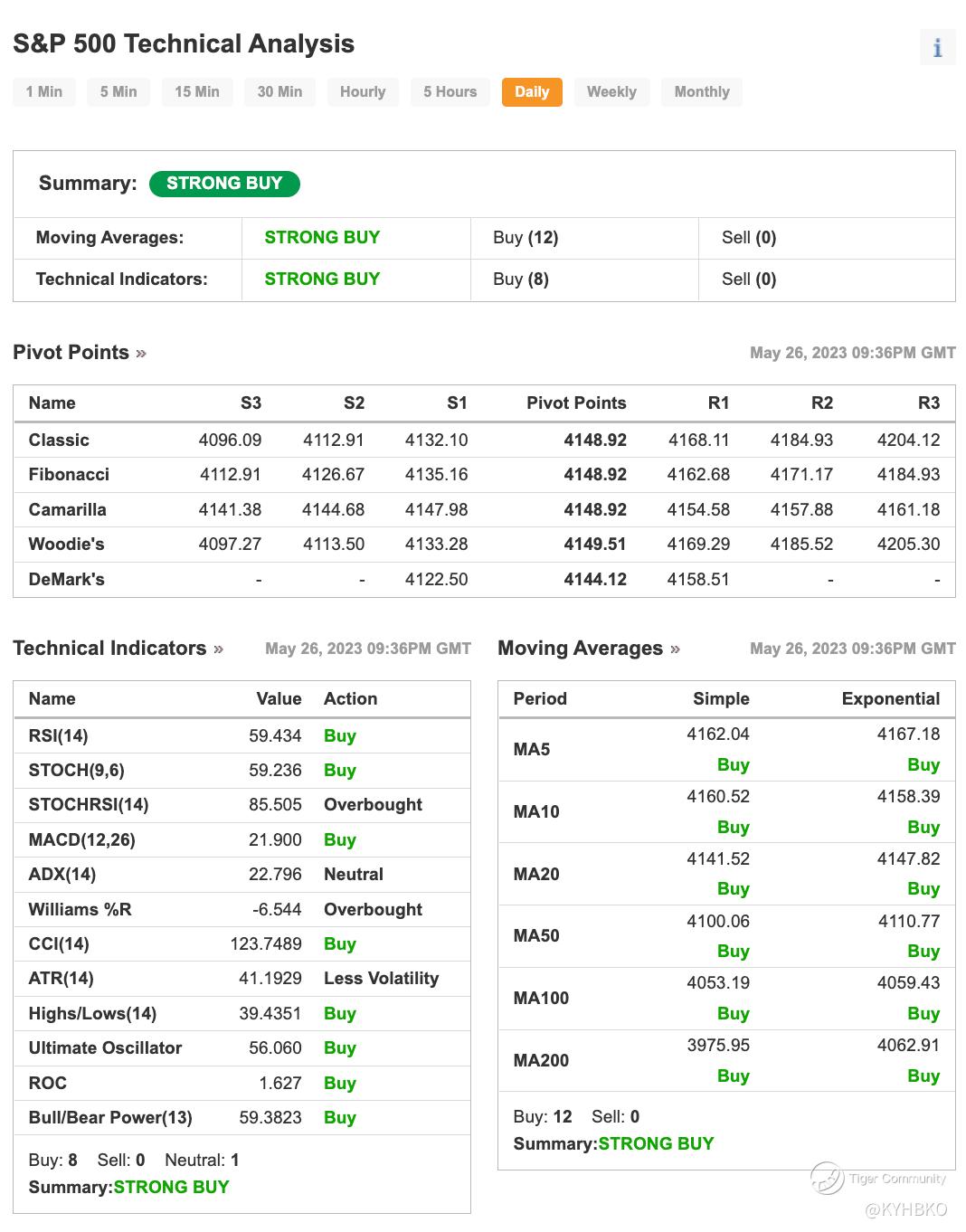 From the technical indicators, the market should be on an uptrend in the coming week. Personally, the market is expecting some volatility due to macro factors like Debt Ceiling and other economic data.