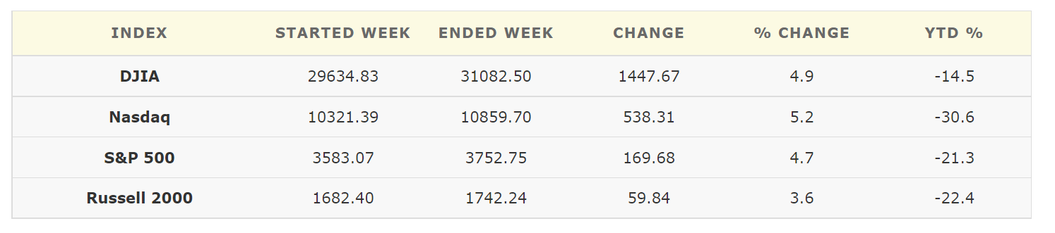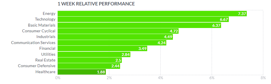 Energy was the top performer this week with a gain of 7.3%. Technology came in second place with a gain of 6.6%. On the flip side, healthcare (+1.8%) and consumer staples (+2.2%) showed the slimmest gains.