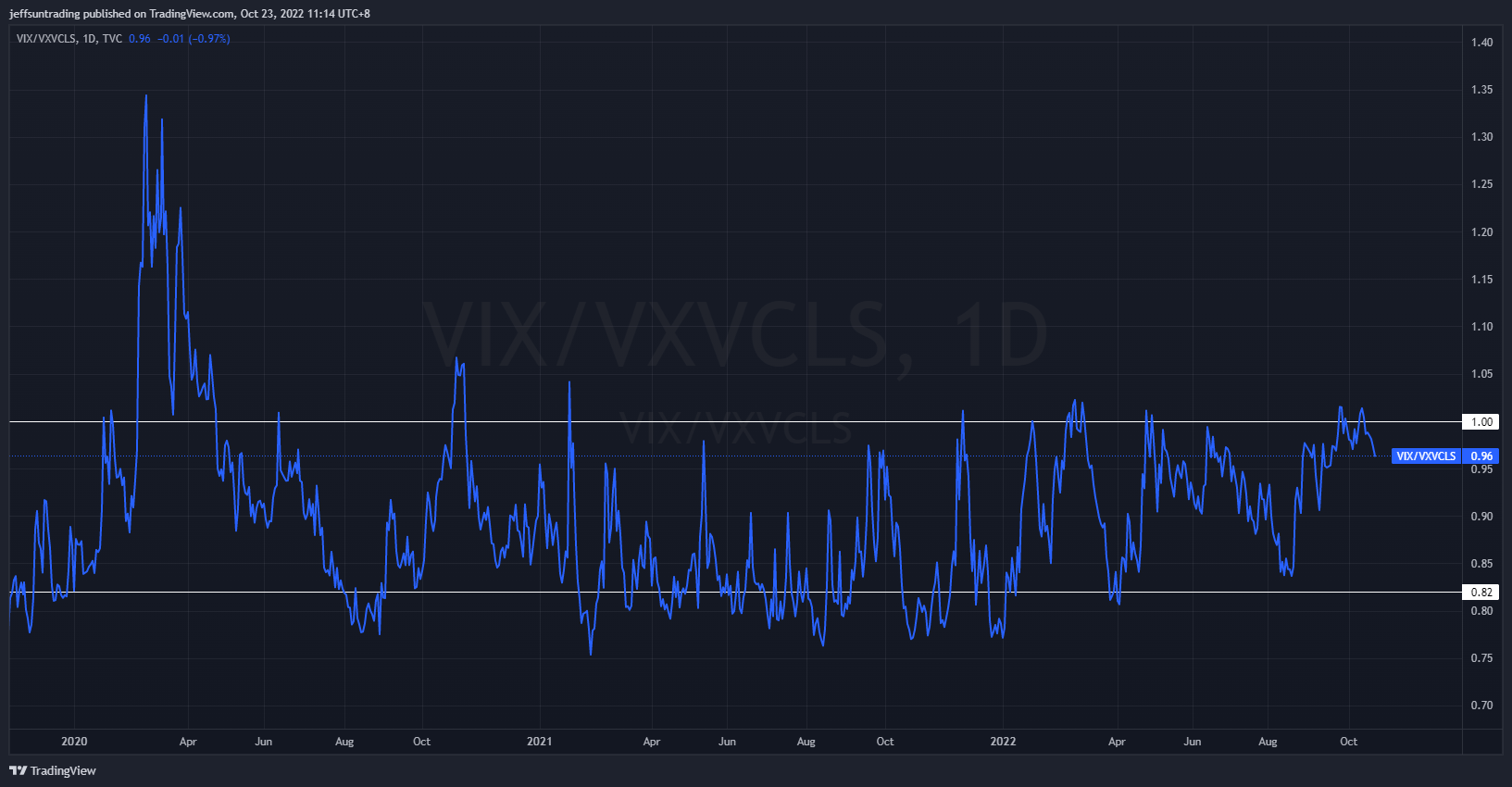The VIX/VXV measures the ratio between 1-month implied volatility and 3-month implied volatility, which is helpful as it filters out higher baseline readings on VIX.
