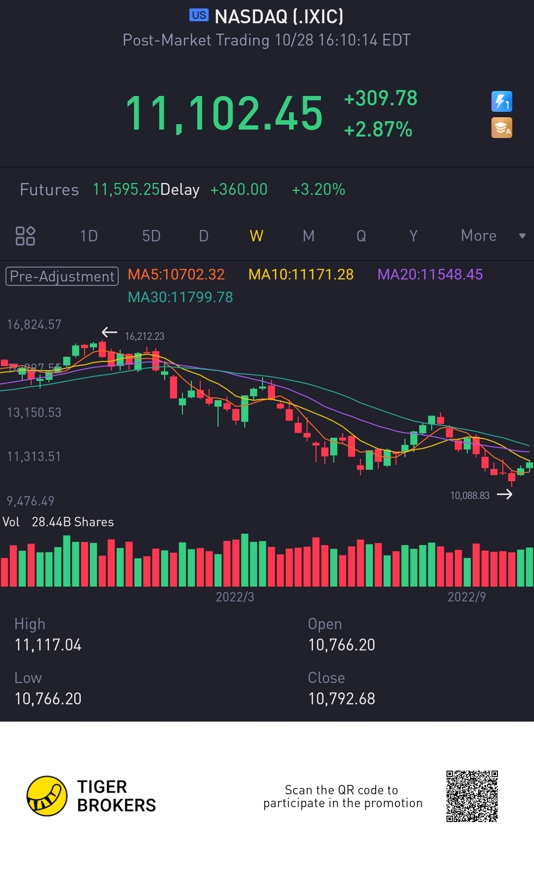 $NASDAQ(.IXIC)$Thanks economy data shows lower than expected inflation, and give more chance to raise the interest 0.5 instead of 0.75. The market cheers with huge rise and give a beautiful up sign on weekly trend.