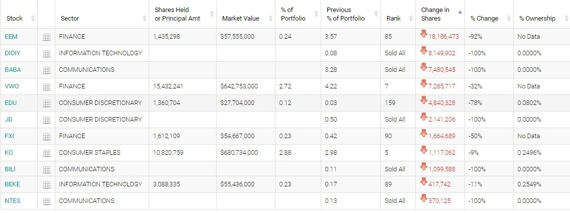 The Company added positions in $Baidu(BIDU)$ and $NIO Inc.(NIO)$ . It also liquidated 99 stocks, including 7.48 million shares of$BABA, $2.14 million shares of$JD.com(JD)$ , valued at $123.9 million; $Accenture PLC(ACN)$ 211,086 shares worth $71.2 million; $Honeywell(HON)$ 262,200 shares worth $51 million; $American Tower(AMT)$ $177,471 shares worth $44.6 million; also includes $NetEase(NTES)$, $Bilibili Inc.(BILI)$ and $DiDi Global Inc.(DIDI)$ , etc.