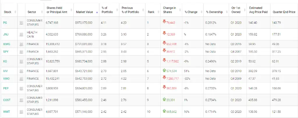 In addition, companies such as $Pepsi(PEP)$ , $Costco(COST)$ and $Wal-Mart(WMT)$ are among the top ten holdings.