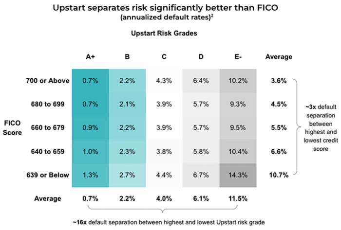 In theory, its evaluation tool should capture risks that traditional scoring models such asFair Isaac's(FICO-0.20%)FICO score might miss. Upstart's model appears to have worked well in this regard, at least according to an updated analysis recently released by Upstart.