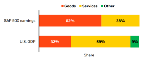 Consumer spending is in the process of shifting toward services and away from goods. Goods account for 62% of the S&P 500’searningsthis year; while services contribute more to US GDP.